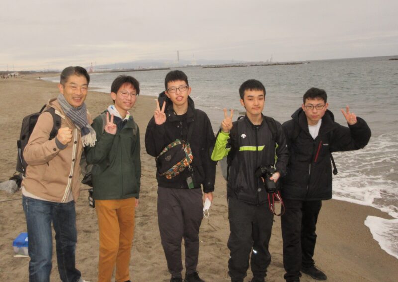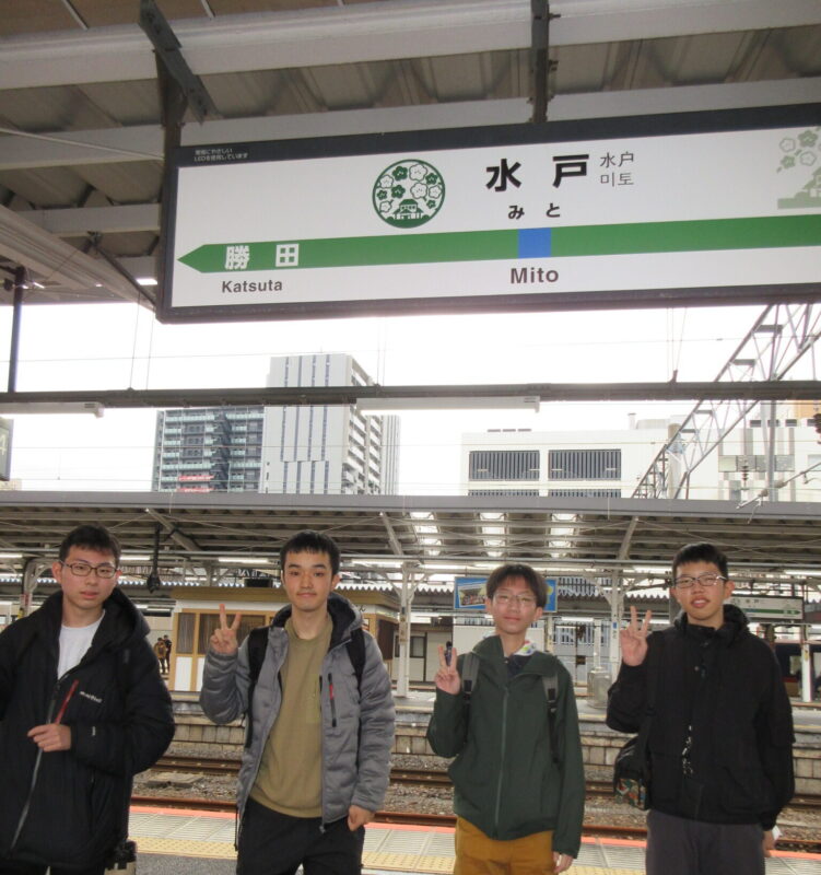↓(右から)Nさん・Tさん(高2)・Yさん(高1)・Nさん(同)・D教諭。水戸が目的地ですか?