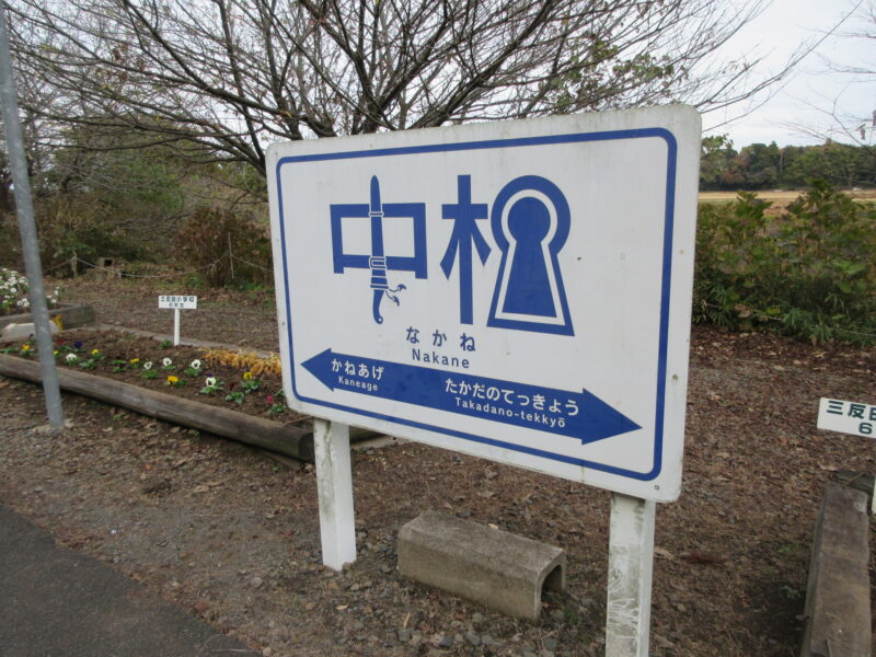 この沿線では、駅名表や町中の道案内版がユニークに図案化されているのでした。中根駅は近くに前方後円墳があり鉄剣が出土しているとのこと