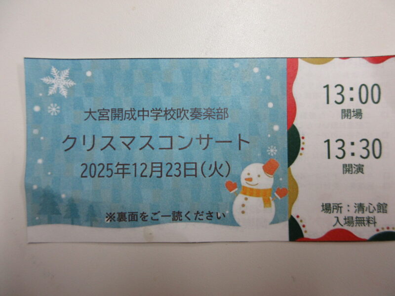 ――ところで今朝、登校あいさつに立っていると嬉しいお誘いが。中学吹奏楽部のWさんから「ぜひ来てください」と校内クリスマスコンサートのチケットをいただきました。もちろん喜んで!