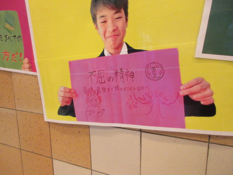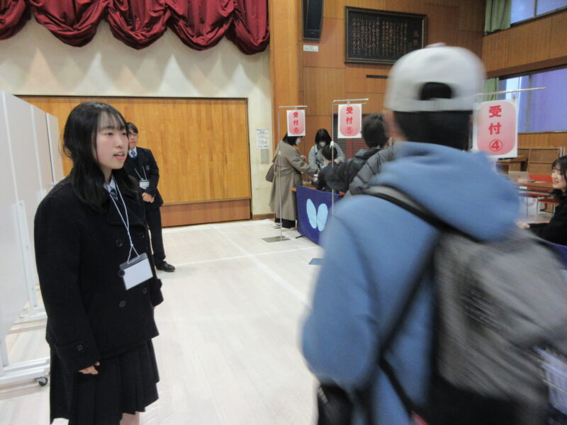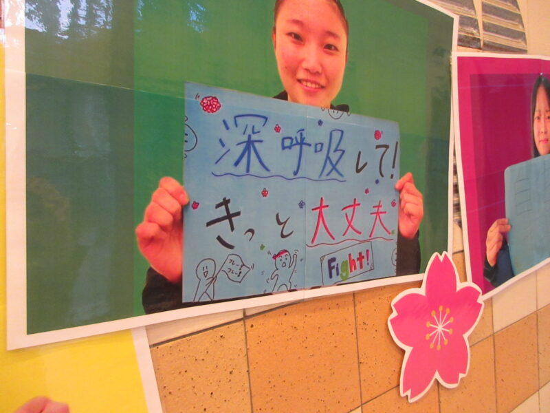 ↓ 受付会場入口では、在校生たちからの心を込めたエールでお迎え