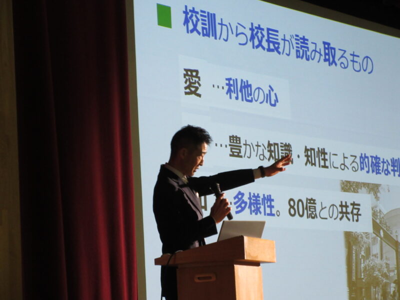 校訓「愛知和」を現代的に解釈するにあたり、私が影響を受けた哲学やことば、学校運営や生徒との関係、また創立者の遺訓への私の見解などについてお話ししました。