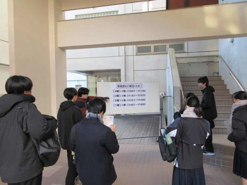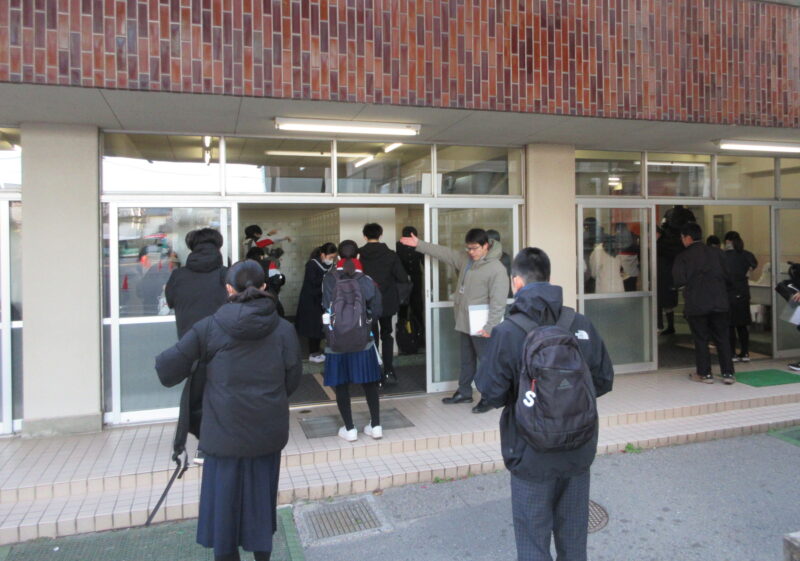 さて、皆さんをお迎えしようと校門へ向かい開門2分前(7:28)、すでに受験生が校門前に20mほど列をつくっていました。高校入試ではあまり記憶にないことです。
