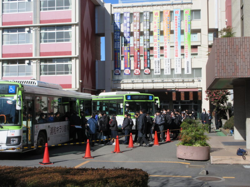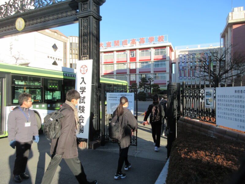 7:30~8:00の間、大宮駅からの直通バスが次々到着し大勢の受験生が降り立ちます。