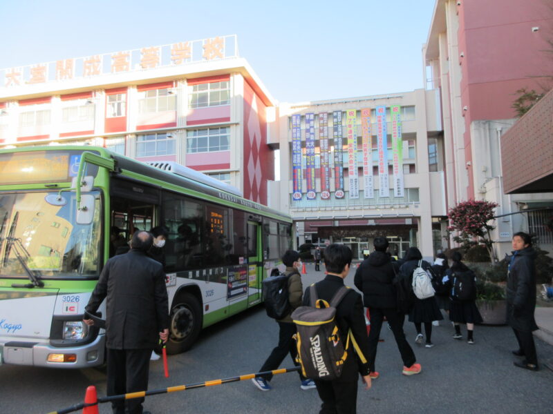 7:30~8:00の間、大宮駅からの直通バスが次々到着し大勢の受験生が降り立ちます。