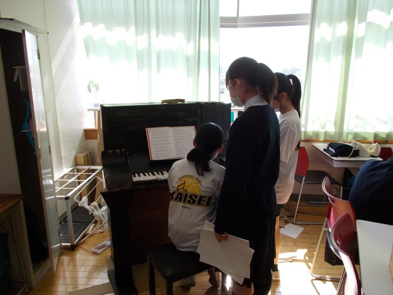 ↓ 中学校舎へ。学年ごとのテーマに沿って、様々な発表と展示を。そのピアノ…え、えっ?
