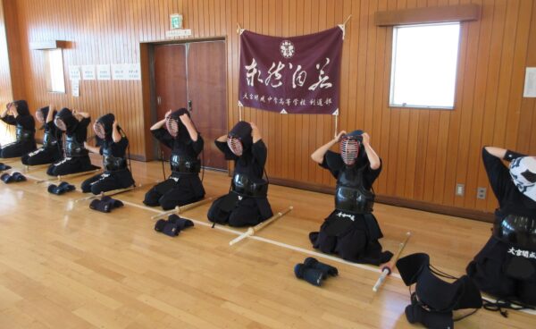 ↓ 次に剣道具を付けて稽古。生徒が「剣士」に変わる、最も凛々しい瞬間
