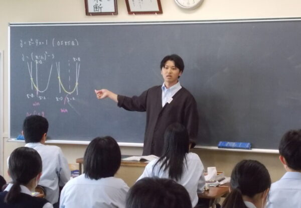 ↓ 3限、数学科のN教諭。高1にて2次関数を指導。訪れた多数の先輩教員を前に「とても緊張してしまった」。そうは見えませんでしたが