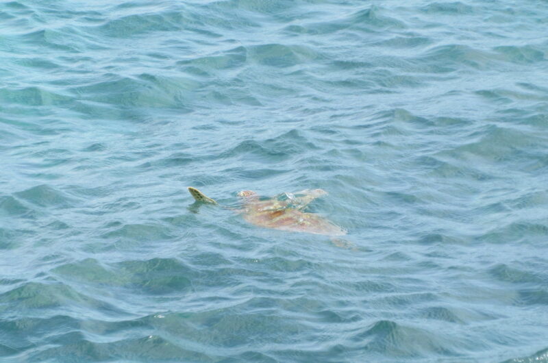 ↓ フェリーを降りてすぐウミガメがお出迎え。3~4頭があちこちのんびり浮いたりもぐったり…