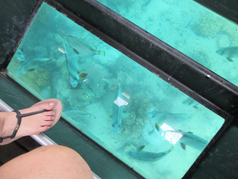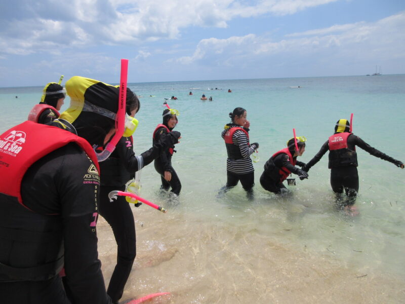 ↓ 生徒たちは「シュノーケリング」「グラスボート体験」を選択できるようになっています。ビーチは目の前、小舟がグラスボート