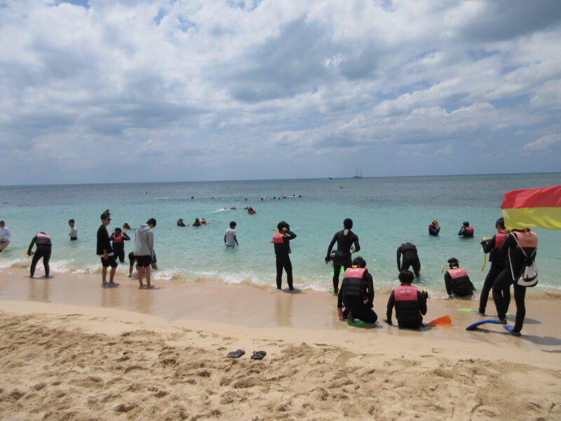 アクティビティは安全第一、教員陣で管理を分担します。校長は浜からシュノーケリング監視、白い砂と青い海は日差しが半端ではありません。日焼け止め必須!