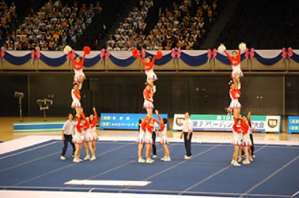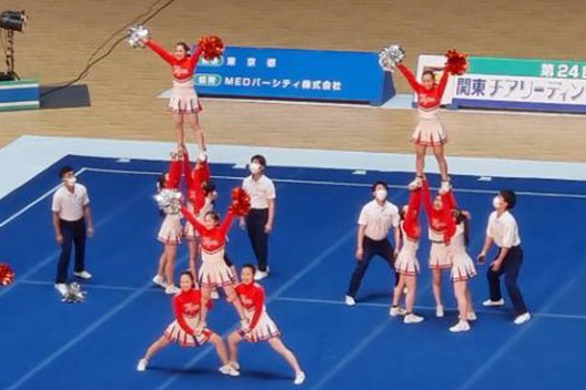 モットーは元気・勇気・笑顔。初心者からできるダンスやスタンツ、タンブリングで構成する迫力ある競技です。
