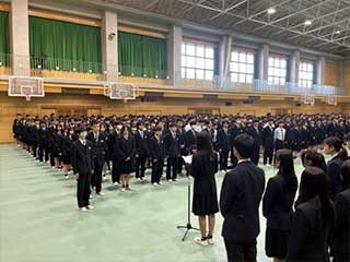 4月9日(木)令和7年度の対面式・始業式が行われました。対面式では入学したばかりで緊張している1年生を、新学期が始まる2・3年生が温かく迎え入れていました。先輩方が拍手をする中、1年生は入場し、勇気づけられている様子が伺えました。