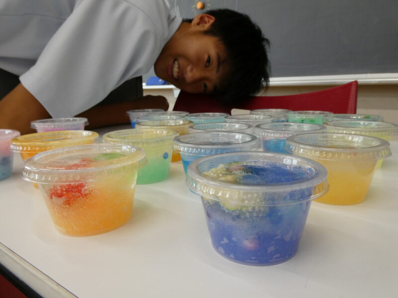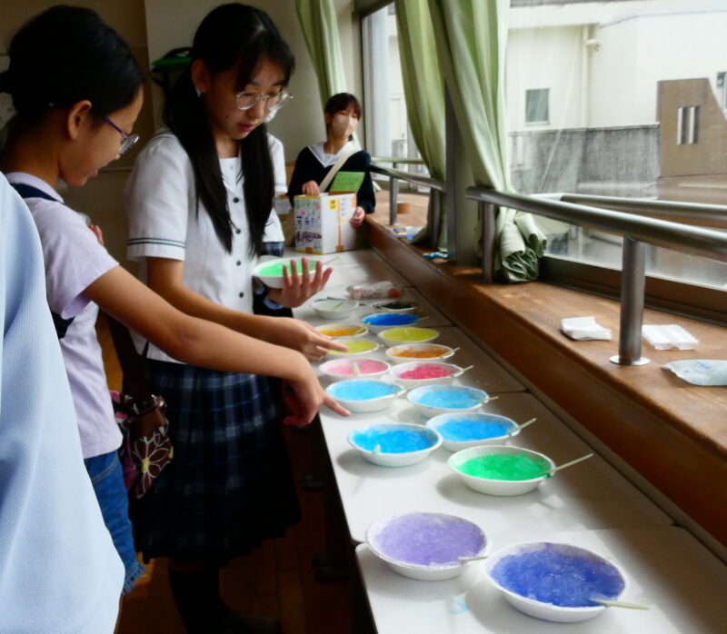 つくり方自体は簡単で、とてもきれいに仕上がるのですが……お客様をお迎えして行うには、大量の保冷剤が必要。そのため、担当の生徒たちは文化祭2週間前から挨拶運動や教室の訪問、回収箱の設置を行い、学校中から保冷材を回収するべく奔走していました。