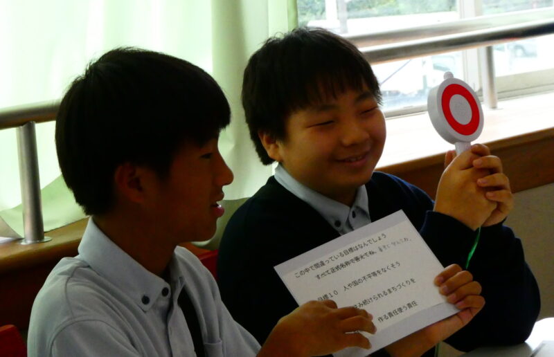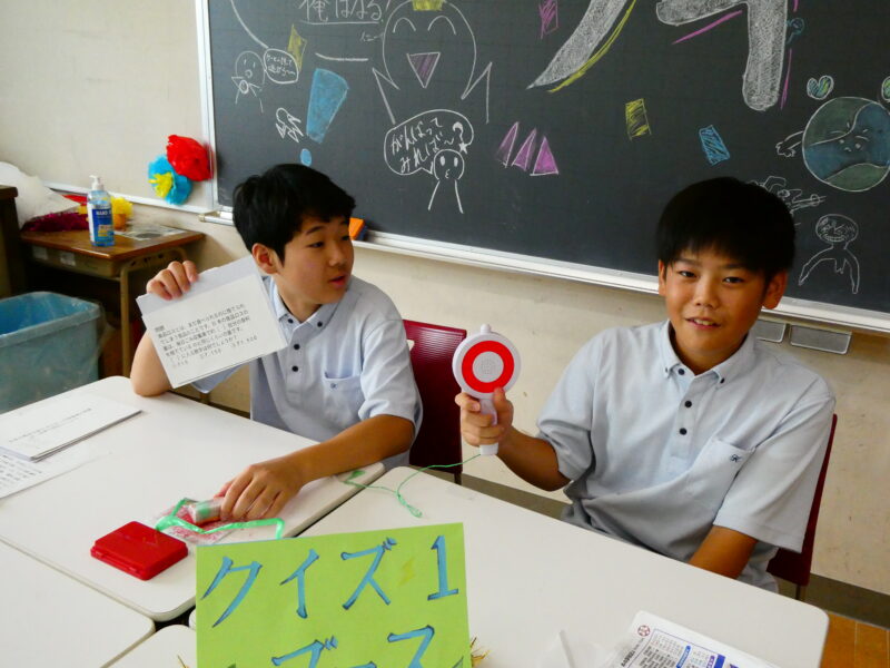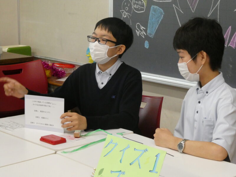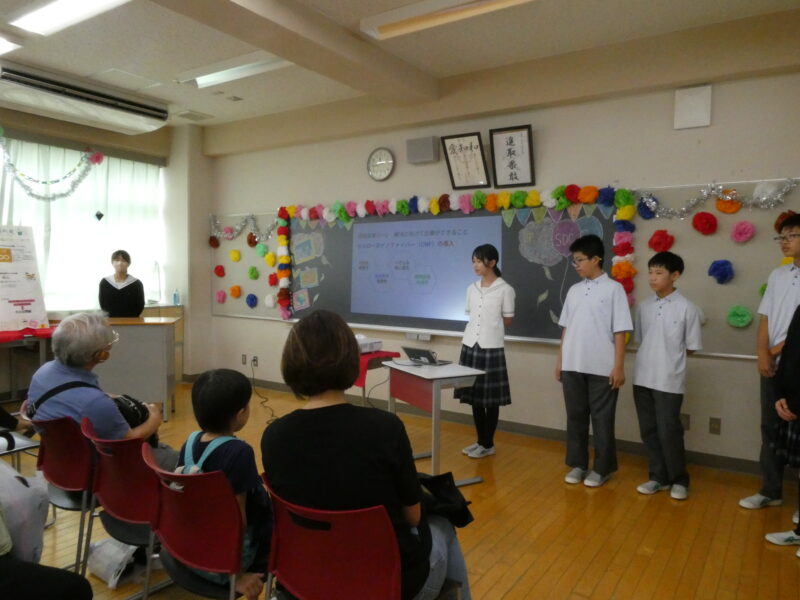 SDGsクイズでは、生徒が作問したSDGsに関するクイズを出題しました。プレゼンテーション発表でも環境問題について調べている生徒たち。なかなか難しい問題が多かったようですが……