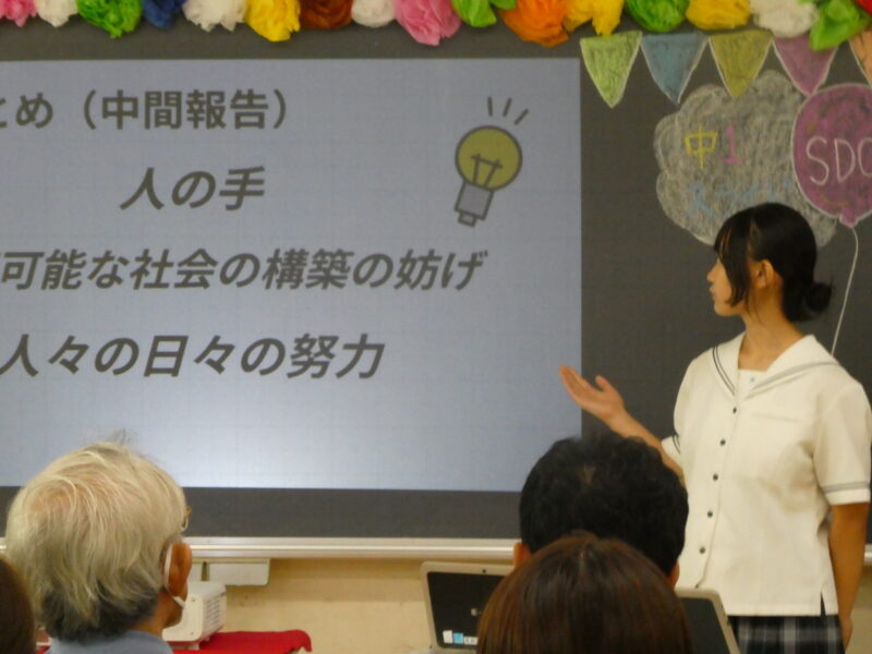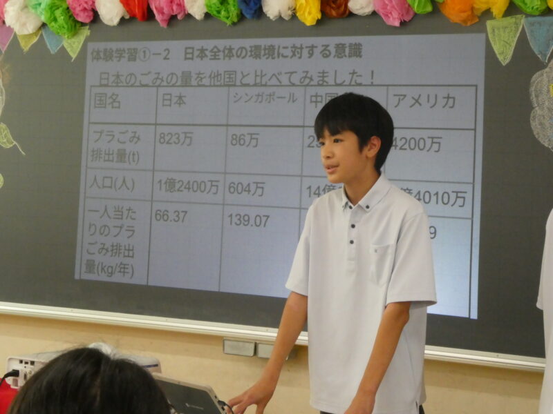 プレゼンテーション発表では、グループに分かれて「身近な環境問題」に関する研究テーマを設定し、研究を行い、その成果をスライドを用いて発表しました。どのグループもとてもよく準備しており、中1とは思えないくらい素晴らしい発表をしていました。