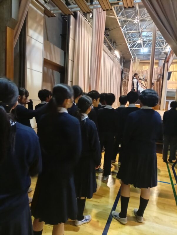 ↓舞台袖で出番を待つ生徒。司会を担当する合唱委員さんの合図で、いよいよ演奏が始まります。