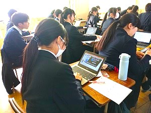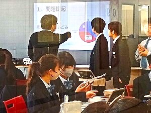 ↓中学1・2年生は、テーマごとにグループで探究を進めています。どのようなスライドにしたらいいか、真剣に話し合っていました。