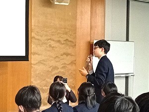 今回は財務省関東財務局の方、3名にお越しいただきました。そして、そのうち2名は本校一貫部の卒業生でもあります。お二人の卒業生から後輩に向けて、中高時代のお話から大学生活、現在のお仕事についてのプレゼンを行っていただきました。