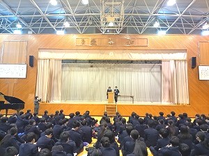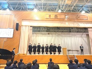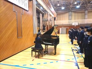 19期生は、中学の集会に参加するのはこの日が最後でした。3年生の校歌・学園歌の指揮者や伴奏者が中学の集会で演奏するのもこれで最後。1年間指揮・伴奏をしてくれた3人、お疲れさまでした!