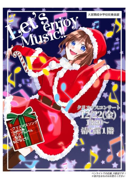 こんにちは!中学吹奏楽部です! 最近は凍えそうなほど寒いですよね… 心も身も耳も温まりたいという皆さん! 12月2(続きを読む)